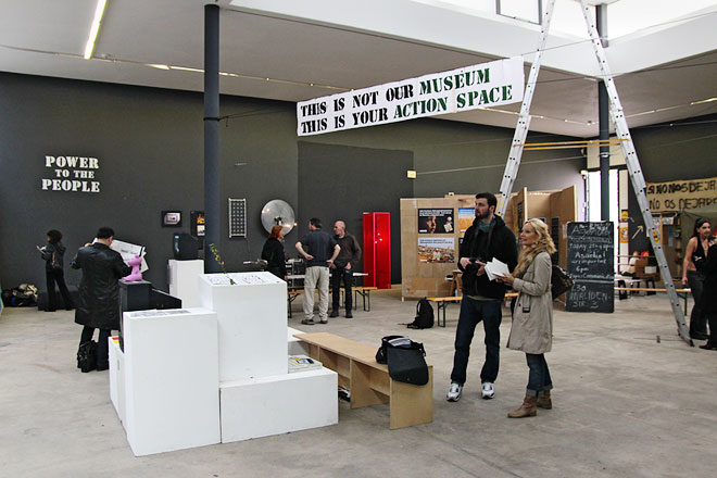Estos grupos se instalaron en una de las plantas del KW y construyeron su propia plaza ocupada. En este espacio además los diferentes colectivos establecen un diálogo con el público asistente.